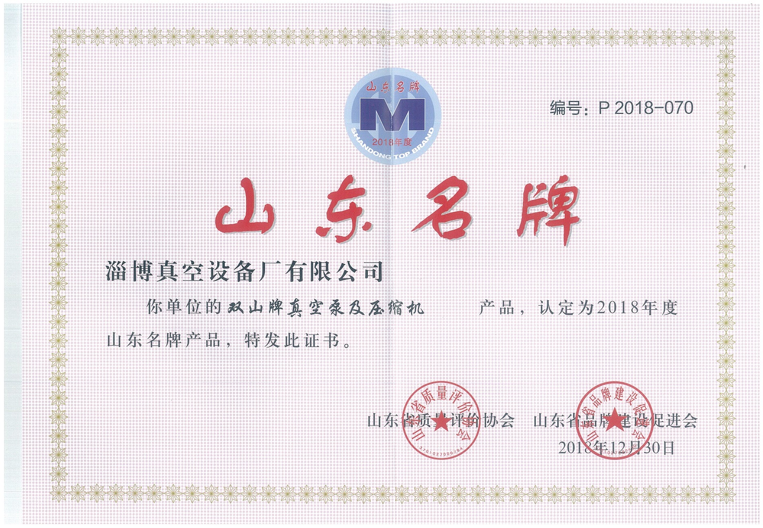 公司生產(chǎn)的“雙山”牌真空泵被山東省質(zhì)量評價協(xié)會和山東省品牌建設(shè)促進(jìn)會認(rèn)定為山東名牌