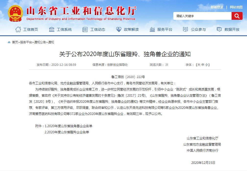 12月15日,根據(jù)《關(guān)于公布2020年度山東省瞪羚、獨(dú)角獸企業(yè)的通知》魯工信創(chuàng)[2020]222號(hào)文,省工業(yè)和信息化廳確定5家企業(yè)為2020年度山東省獨(dú)角獸企業(yè)、372家企業(yè)為2020年度山東省瞪羚企業(yè)。雙山真空作為山東省真空設(shè)備龍頭企業(yè),以領(lǐng)先的科技研發(fā)和穩(wěn)定增長(zhǎng)的市場(chǎng)占有率入選為2020年度山東省瞪羚企業(yè)!