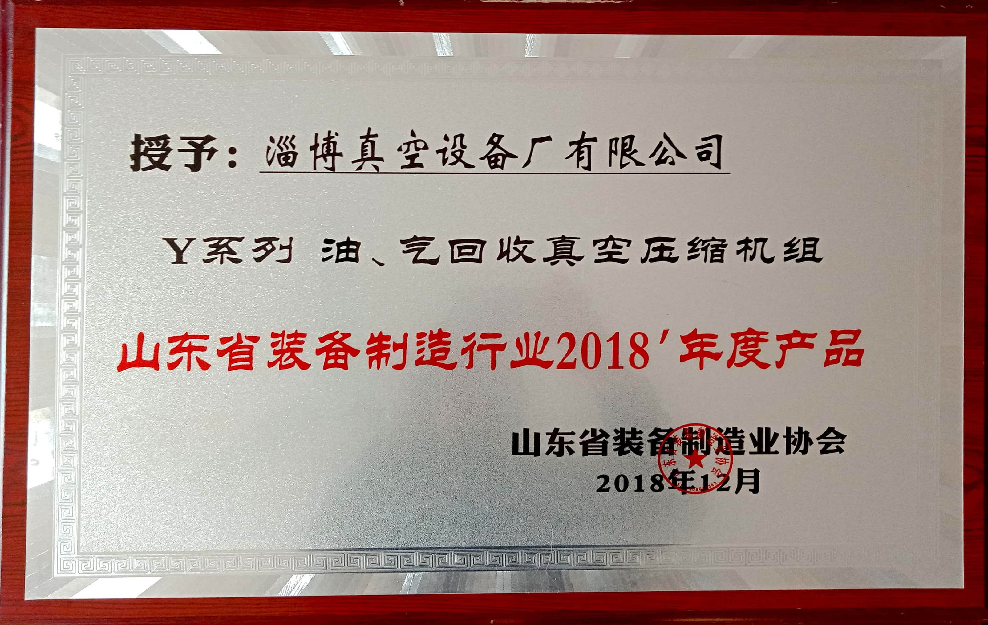 淄博真空設(shè)備廠有限公司被授予“山東省裝備制造行業(yè)優(yōu)秀企業(yè)”、“優(yōu)秀會員企業(yè)”,公司董事長黃毅同志被授予“山東省裝備制造業(yè)優(yōu)秀企業(yè)家”; 公司產(chǎn)品Y系列油、氣回收真空壓縮機組獲2018山東省裝備制造行業(yè)年度產(chǎn)品。